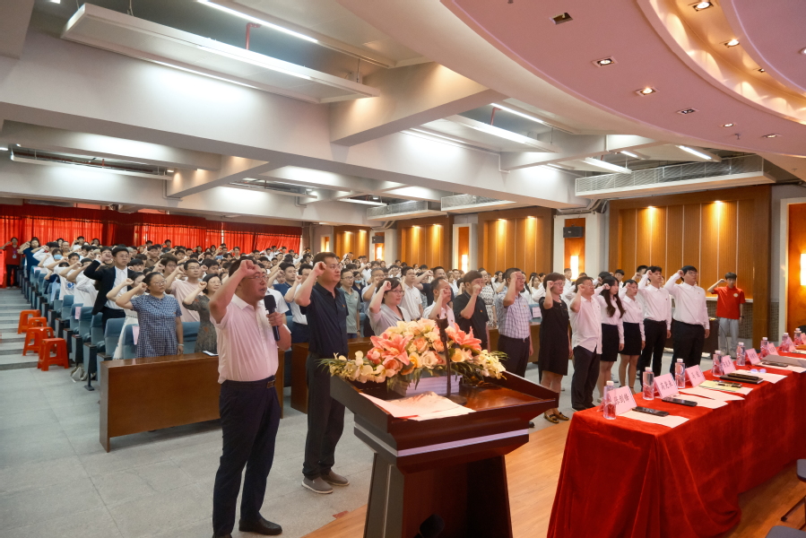 “我志愿加入中國共產(chǎn)黨……”在高堯來副書記帶領(lǐng)下,新黨員面向鮮艷的黨旗莊嚴(yán)宣誓,與會(huì)黨員們也一同重溫入黨誓詞。
