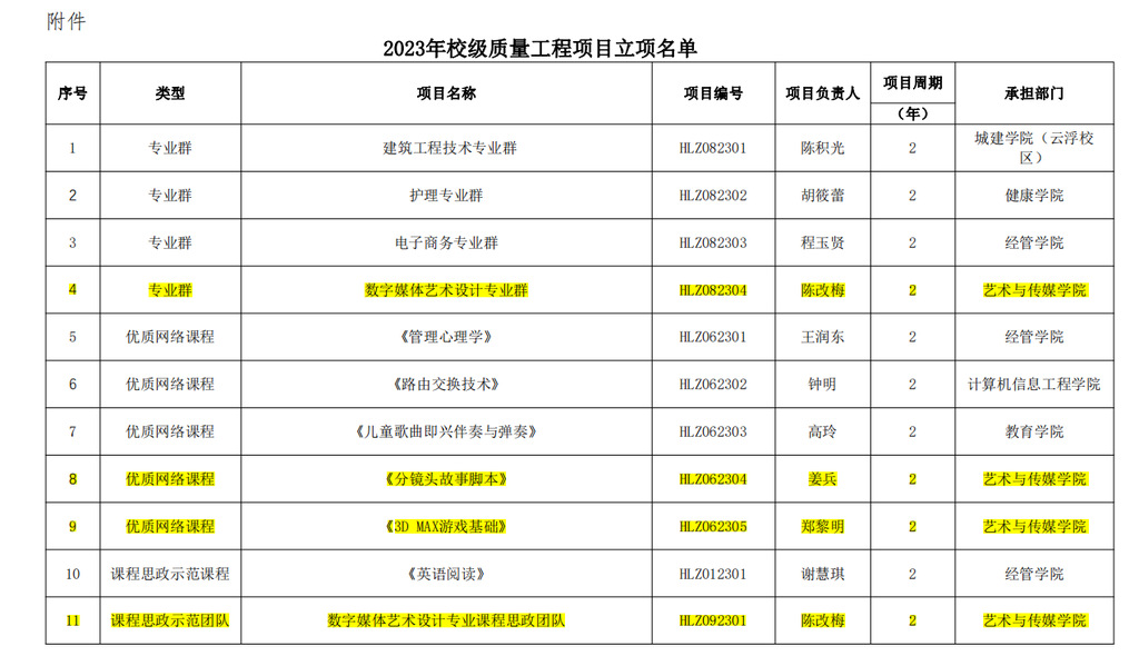 根據(jù)《關(guān)于組織開展2023年校級職業(yè)教育教學(xué)質(zhì)量與教學(xué)改革工程項目申報的通知》(華立職院〔2023〕93號 ),經(jīng)教師個人申報、二級學(xué)院和系部推薦、教務(wù)處形式審查、專家評審、校內(nèi)公示等環(huán)節(jié),現(xiàn)將2023年校級高等職業(yè)教育教學(xué)質(zhì)量與教學(xué)改革工程(以下簡稱“校質(zhì)量工程”)項目立項名單予以公布(附件1)。