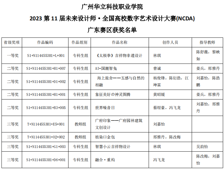 在校領導及教務處的大力支持和指導下,藝術與傳媒學院師生通過共同努力,層層篩選,師生獲獎多項,其中獲國賽一等獎1項,獲省賽一等獎1項、二等獎4項、三等獎4項:(具體獲獎及證書如下)