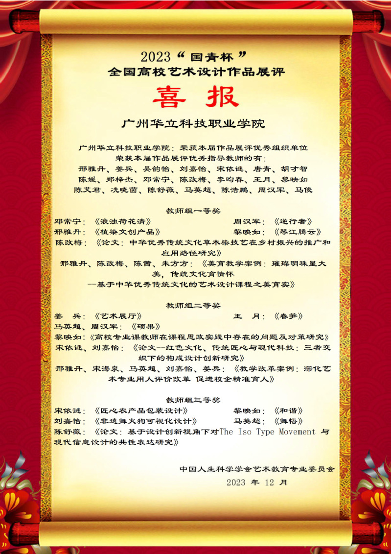 基于此,中國(guó)人生科學(xué)學(xué)會(huì)藝術(shù)教育專業(yè)委員會(huì)授予廣州華立科技職業(yè)學(xué)院為本屆作品展評(píng)優(yōu)秀組織單位;授予馬俊、周漢軍、陳改梅、邢雅丹、黎映如、劉嘉怡、姜兵、吳韻怡、宋依謎、唐青、胡才智、陳媛、鄭梓杰、鄧常寧、李昀春、王月、陳艾君、冼曉茵、陳舒薇、馬英超、陳浩鵬為本屆作品展評(píng)優(yōu)秀指導(dǎo)教師。