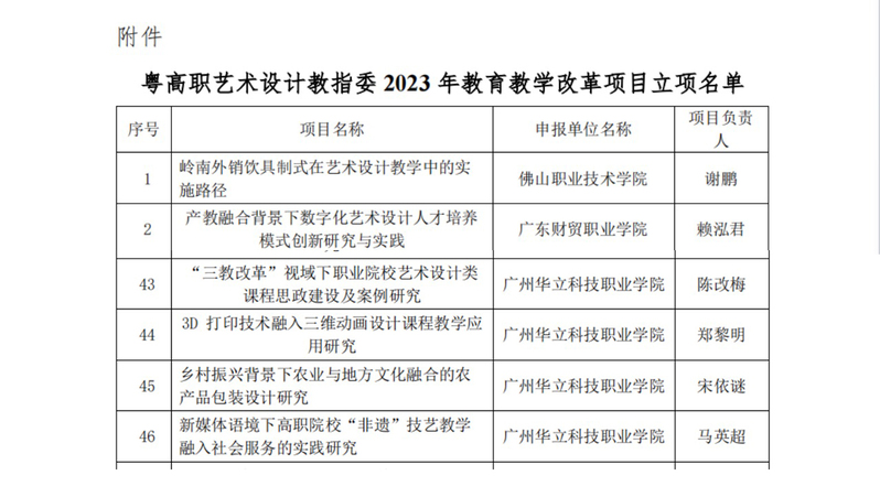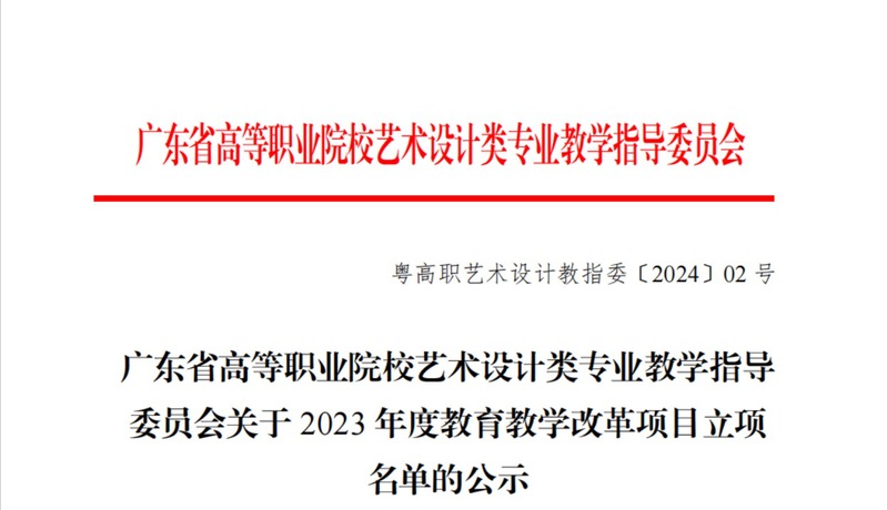 近日,廣東省高等職業(yè)院校藝術設計類專業(yè)教學指導委員會公布了2023年度教育教學改革項目立項結果。藝傳學院陳改梅、鄭黎明、宋依謎、馬英超老師的《“三教改革”視域下職業(yè)院校藝術設計類課程思政建設及案例研究》、《3D打印技術融入三維動畫設計課程教學應用研究》、《鄉(xiāng)村振興背景下農業(yè)與地方文化融合的農產(chǎn)品包裝設計研究》、《新媒體語境下高職院?!胺沁z”技藝教學融入社會服務的實踐研究》獲得立項。此次教學改革課題獲得立項,是學校領導重視科研工作及藝傳學院教師積極參與藝術設計類專業(yè)教學改革的結果。