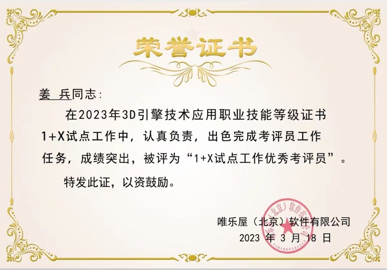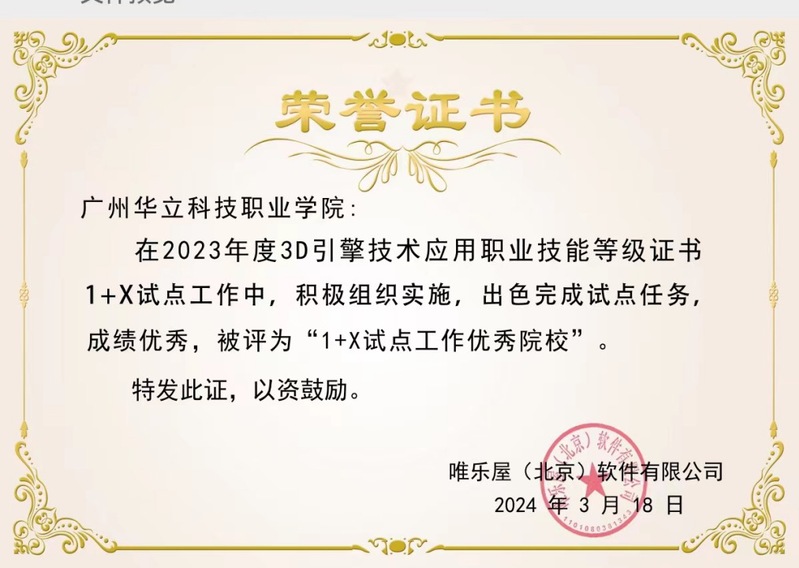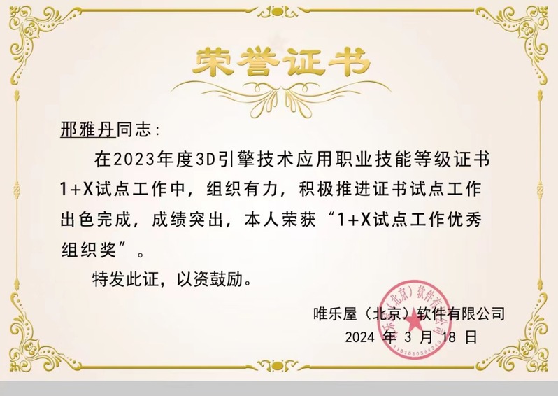 2024年3月18日,藝術(shù)與傳媒學(xué)院在國(guó)家指定1+X職業(yè)院校職業(yè)證書(shū)認(rèn)證單位唯樂(lè)屋年度表彰大會(huì)上獲得“1+X試點(diǎn)工作優(yōu)秀院校”、“優(yōu)秀組織獎(jiǎng)”、“優(yōu)秀教師”、“優(yōu)秀考評(píng)員”獎(jiǎng)項(xiàng)。