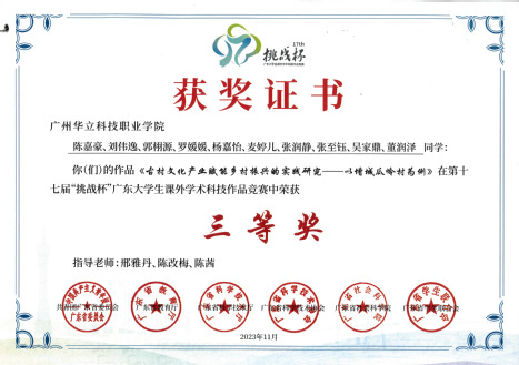 近期,在第十七屆“挑戰(zhàn)杯”廣東大學(xué)生課外學(xué)術(shù)科技作品競賽中,我院學(xué)生項目榮獲省級三等獎兩項。