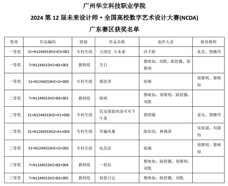 本次大賽自啟動(dòng)以來,吸引了全國(guó)1891所高校的積極參與,共收到作品298763件,設(shè)立了29個(gè)省級(jí)賽區(qū)。經(jīng)過激烈的校級(jí)賽、資格賽、省級(jí)初賽、省級(jí)決賽及全國(guó)總決賽的多輪選拔,我校藝術(shù)與傳媒學(xué)院師生取得了令人矚目的成績(jī):在全國(guó)總決賽中,獲得學(xué)生組二等獎(jiǎng)1項(xiàng)。在廣東省賽區(qū)獲獎(jiǎng)13項(xiàng),其中學(xué)生組一等獎(jiǎng)2項(xiàng),二等獎(jiǎng)3項(xiàng),教師組一等獎(jiǎng)1項(xiàng),二等獎(jiǎng)1項(xiàng),三等獎(jiǎng)2項(xiàng),優(yōu)秀指導(dǎo)教師4項(xiàng)。