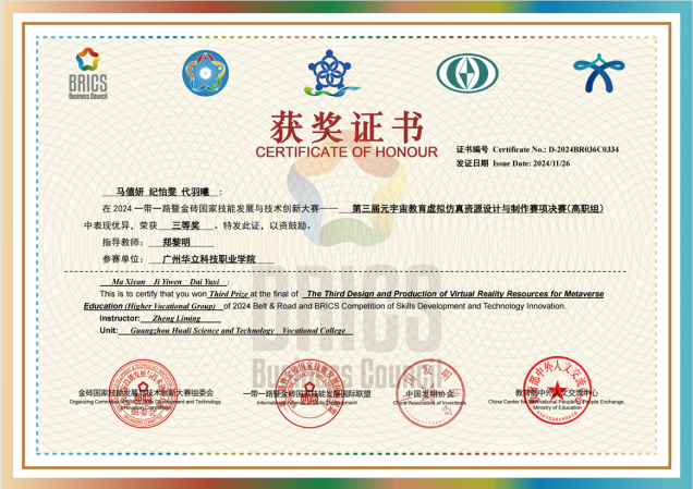 2024年11月15-17日,2024“一帶一路暨金磚國家技能發(fā)展與技術創(chuàng)新大賽·第三屆元宇宙教育虛擬仿真資源設計與制作”賽項全國決賽在廣州舉行,來自全國16個省、自治區(qū)、直轄市及新疆生產建設兵團的77所學校的101支師生隊伍參加比賽,藝術與傳媒學院動漫制作技術系主任鄭黎明老師指導的兩支參賽隊(李衛(wèi)東,梁祖強,高晴;馬僖妍,紀怡雯,代羽曦)在為期三天的比賽中脫穎而出,獲得2項銅獎。