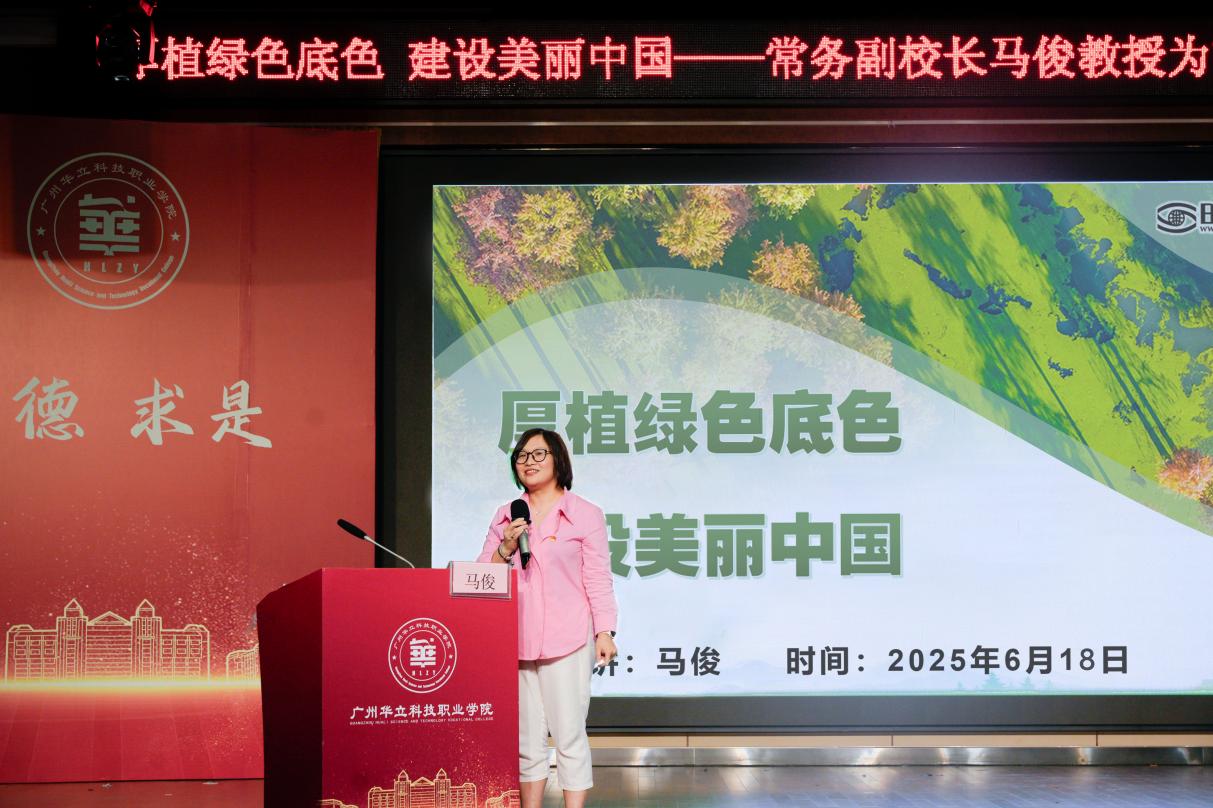 為深入貫徹落實(shí)習(xí)近平生態(tài)文明思想,2025年6月18日晚上6點(diǎn)在圖書(shū)館八樓禮堂,廣州華立科技職業(yè)學(xué)院常務(wù)副校長(zhǎng)馬俊教授以“厚植綠色底色 建設(shè)美麗中國(guó)”為主題,為藝術(shù)與傳媒學(xué)院師生帶來(lái)了一堂別開(kāi)生面、意義深遠(yuǎn)的思政課。參加此次思政課的有藝傳學(xué)院院長(zhǎng)朱君、全體輔導(dǎo)員、專業(yè)老師以及23級(jí)400左右學(xué)生,藝傳學(xué)院黨總支書(shū)記陳改梅主持。
