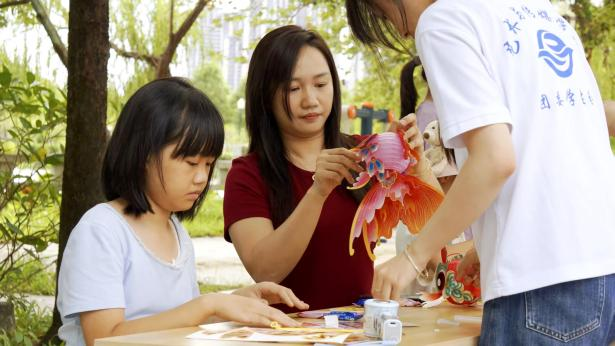 村民們在非遺體驗區(qū)親手嘗試雙節(jié)彩扎魚燈,讓指尖觸碰傳統(tǒng)技藝的溫度;在互動游戲中猜燈謎,讓歡笑裝點團圓的時光。志愿者手把手教學的同時,穿插講解“非遺中的紅色故事”,將文化傳承與黨建教育巧妙結合。這些活動背后,是“政校企農”協(xié)同創(chuàng)新理念的實踐,更是高校對“以文化人、以美育人”的踐行。