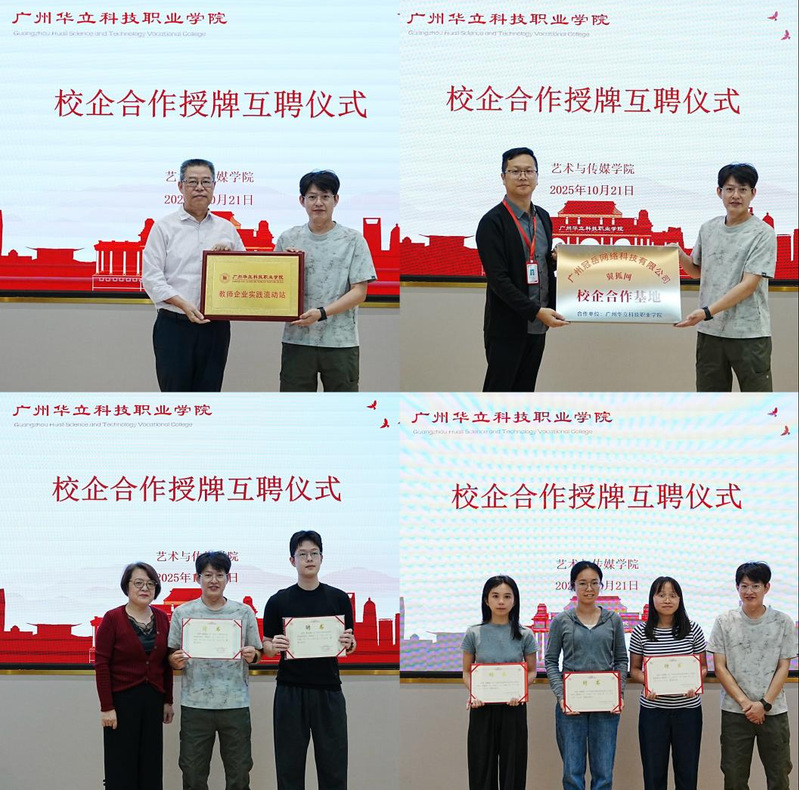 活動在陳改梅書記熱情洋溢的開場中拉開帷幕。首個環(huán)節(jié)是備受矚目的校企合作揭牌互聘儀式。在莊重的氣氛中,陳顯強副校長代表學校向廣州冠岳網(wǎng)絡科技有限公司授予“教師企業(yè)實踐流動站”牌匾;由朱君院長接受謝增福經(jīng)理向藝術與傳媒學院授予“產(chǎn)教融合實踐基地”的牌匾。緊接著,雙方進行了隆重的人才互聘儀式:教務處處長孫麗英為謝增福經(jīng)理、黃龍城項目總監(jiān)頒發(fā)了兼職教師聘書;同時,謝增福經(jīng)理為藝術與傳媒學院的骨干教師頒發(fā)了企業(yè)導師聘書。這一真正意義上的“雙向奔赴”與人才互動,標志著雙方在人才雙向流動、資源共享、協(xié)同育人方面建立了制度化、常態(tài)化的合作機制。