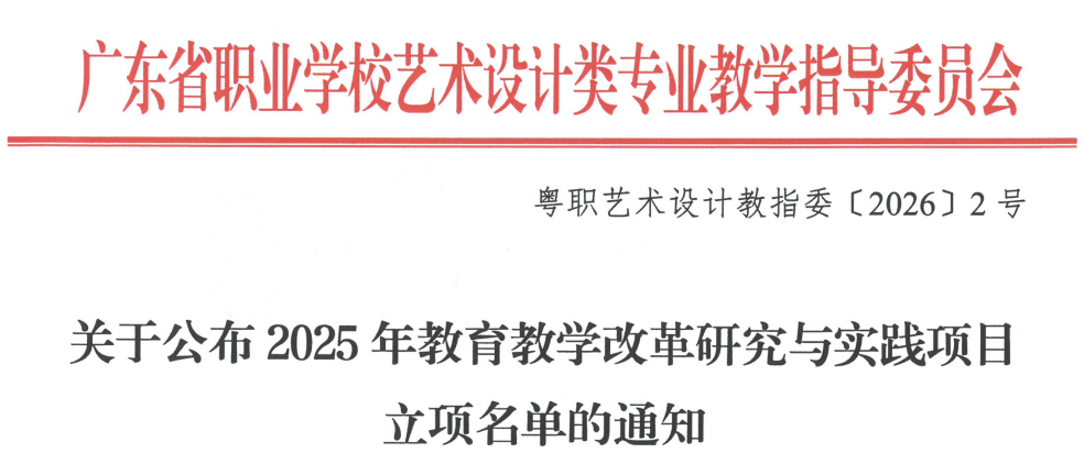 近日,廣東省職業(yè)學校藝術(shù)設計類專業(yè)教學指導委員會公布了2025年教育教學改革研究與實踐項目立項名單。我校藝術(shù)與傳媒學院在此次評審中取得優(yōu)異成績,共有4位教師團隊申報的項目獲得立項。