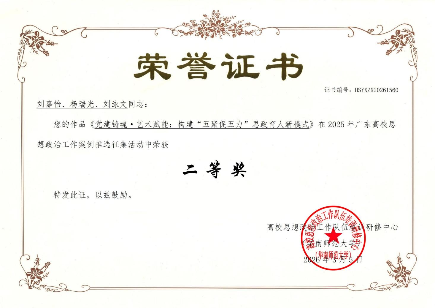 近日,高校思想政治工作隊(duì)伍培訓(xùn)研修中心(華南師范大學(xué))和教育部高校輔導(dǎo)員培訓(xùn)和研修基地(華南師范大學(xué))公布了2025年廣東高校思想政治工作論文、案例、網(wǎng)絡(luò)課程推選征集活動(dòng)結(jié)果。我院積極組織思政工作隊(duì)伍參與評(píng)選,經(jīng)專(zhuān)家評(píng)審,最終斬獲二等獎(jiǎng)1項(xiàng)、三等獎(jiǎng)1項(xiàng):