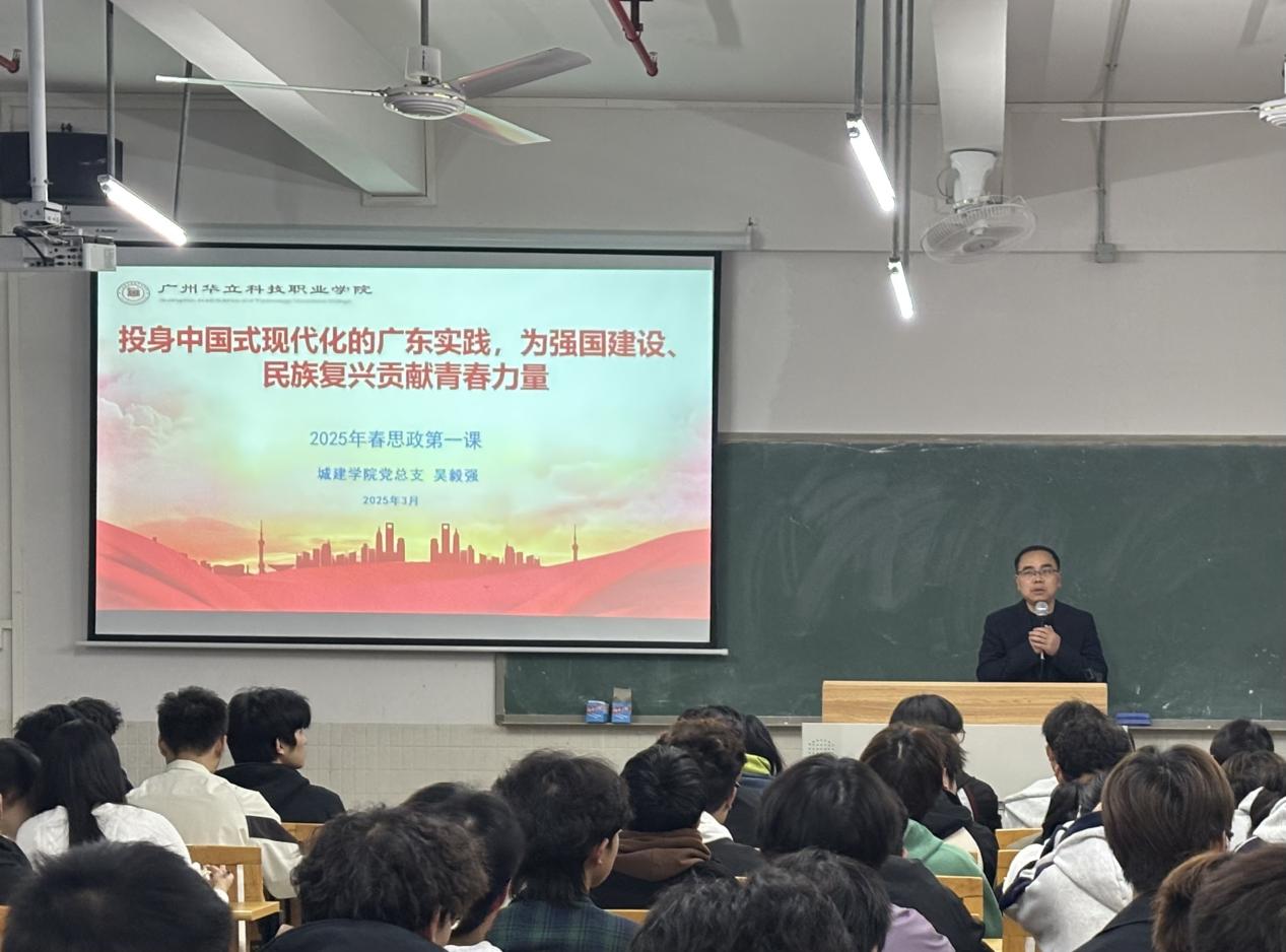為深入學習貫徹黨的二十大和二十屆三中全會精神,引導青年學生深刻理解中國式現(xiàn)代化的深刻內(nèi)涵。3月17日晚,城建學院黨總支書記吳毅強在2教201教室為2024級120名學生代表講授題為“投身中國式現(xiàn)代化的廣東實踐,為強國建設、民族復興貢獻青春力量”的春季學期思政第一課。黨總支專職副書記郭君蘭、組織員陳華林共同參與活動。