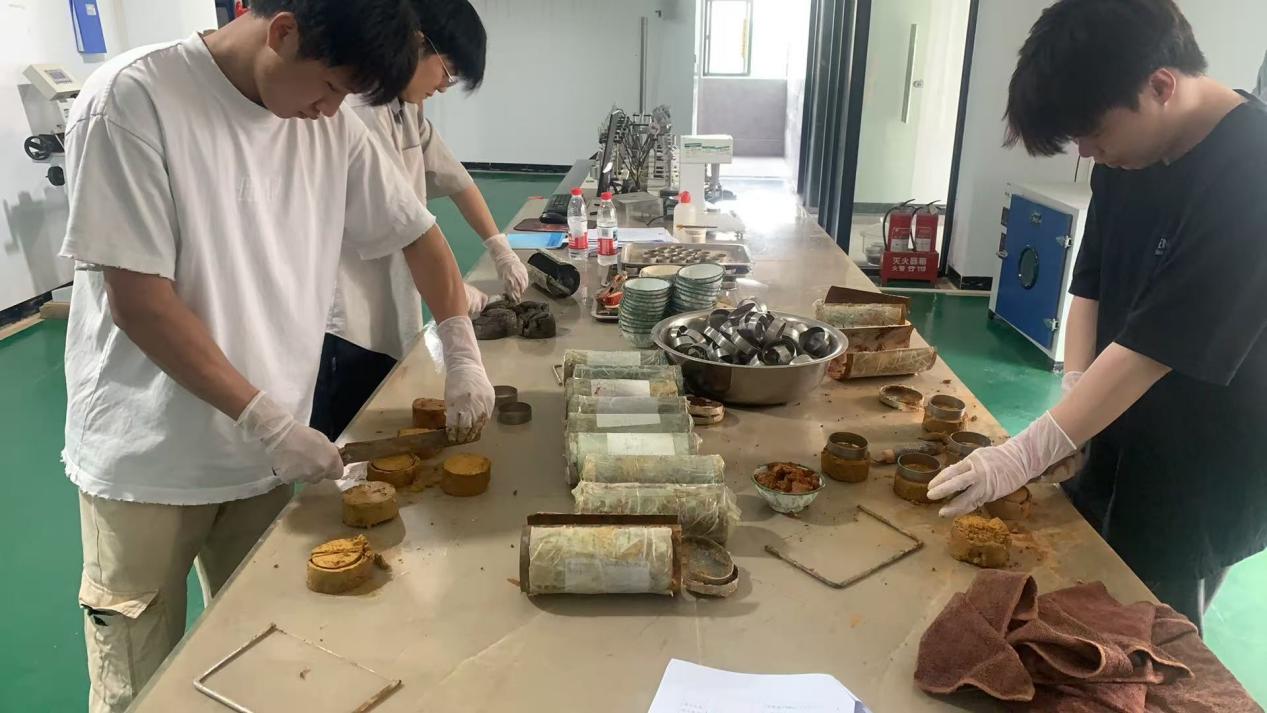 在公司技術(shù)人員的指導(dǎo)下,學(xué)生們系統(tǒng)學(xué)習(xí)及動手實操包括土樣開樣、密度試驗、含水率試驗、快速剪切試驗、界限含水率試驗(液塑限聯(lián)合測定法)、快速固結(jié)模試驗及數(shù)據(jù)處理等七項重要土工試驗內(nèi)容。每一項試驗均為地質(zhì)工程勘察中的核心環(huán)節(jié),不僅對實驗操作技能提出較高要求,也對數(shù)據(jù)分析能力和專業(yè)素養(yǎng)具有深刻檢驗。