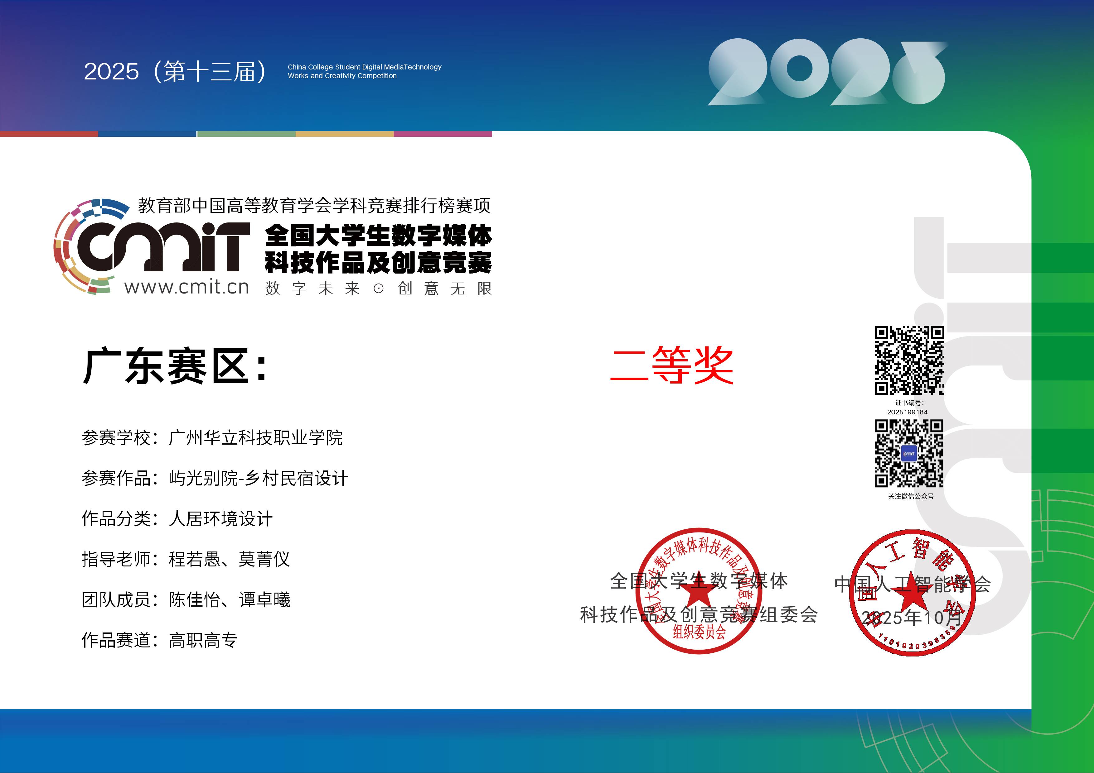 其中,由程若愚、莫菁儀、陳華林老師指導,陳佳怡、馮明月等同學完成的作品《嶼光別院-鄉(xiāng)村民宿設計》、《星火傳承,紅色鑄魂”--黨建主題公園景觀設計》在全國大學生數(shù)字媒體科技作品及創(chuàng)意競賽全國總決賽中榮獲三等獎2項,廣東賽區(qū)中獲二等獎2項;由田婭娟、莫菁儀、陳華林老師指導,何穎詩、馮君怡等同學完成作品《池上幽居靜寄山莊池上居復原與改造設計》、《“廬州軌跡”--道路節(jié)點綠化景觀工程恢復設計》榮獲廣東賽區(qū)三等獎2項。