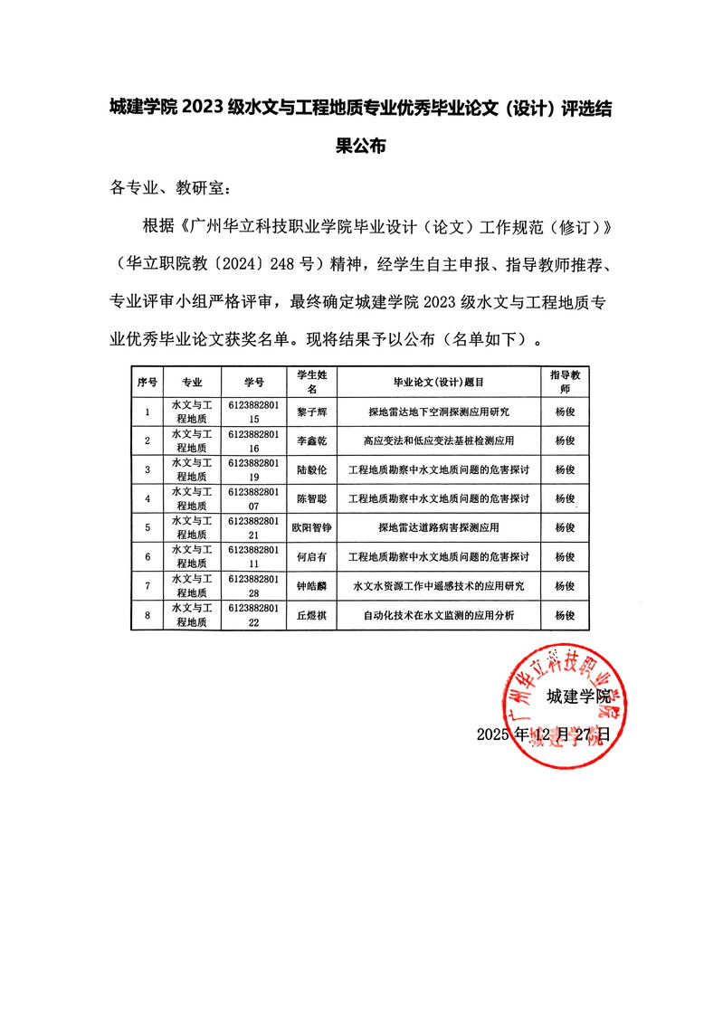 城建學(xué)院2023級(jí)水文與工程地質(zhì)專業(yè)優(yōu)秀畢業(yè)論文(設(shè)計(jì))評(píng)選公布