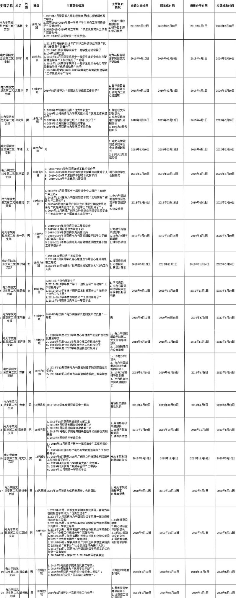 根據(jù)廣州華立科技職業(yè)學(xué)院黨委發(fā)展黨員的要求,由學(xué)生本人提出申請,經(jīng)電力與智能制造學(xué)院黨總支第二黨支部培養(yǎng)考察、民主推薦,黨總支審查,2020年5月10日預(yù)審討論決定將汪惠婷等20位同學(xué)列為近期預(yù)備黨員發(fā)展對象,支部將在近期召開黨員大會(huì)討論他們的入黨問題并上報(bào)黨委審核。為了進(jìn)一步增強(qiáng)發(fā)展黨員的透明度,確保發(fā)展新黨員的質(zhì)量,根據(jù)《中國共產(chǎn)黨發(fā)展黨員工作細(xì)則(試行)》等文件的有關(guān)精神,現(xiàn)將發(fā)展對象的名單公示如下(具體名單見附件):