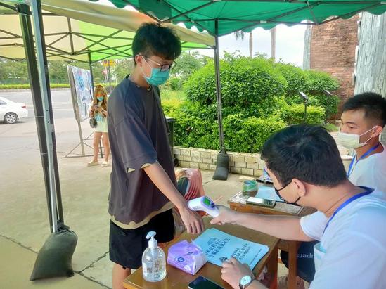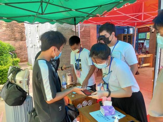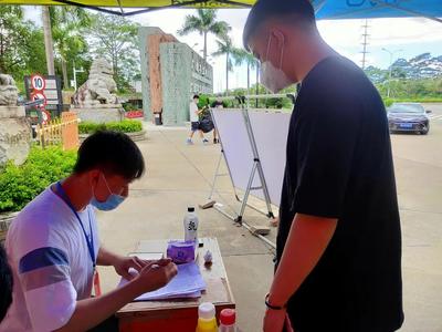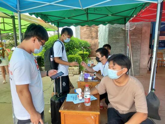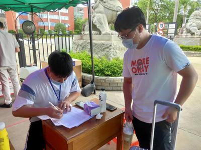 當(dāng)天上午,學(xué)校的正大門早早搭起了帳篷,返校的學(xué)生入校需經(jīng)過各個關(guān)卡,通過檢測體溫、查驗葵花碼、查看移動軌跡,對行李和身體表面消毒,查驗學(xué)生身份和核對學(xué)生宿舍信息等多道程序,方能入校。