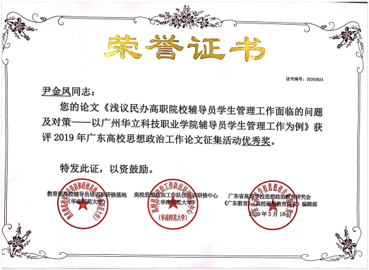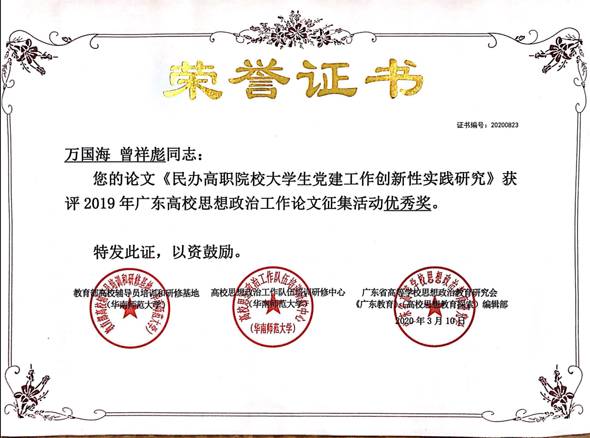 為提升高校思想政治工作隊伍理論素養(yǎng),促進科學研究,廣東省高校思想政治工作隊伍培訓研修中心開展了2019年度高校思想政治工作優(yōu)秀論文征集活動,我院教師積極投稿響應。經(jīng)評審組評審,我院教師喜獲2項榮譽,分別是尹金鳳老師的論文《淺議民辦高職院校輔導員學生管理工作面臨的問題及對策》和萬國海、曾祥彪老師的論文《民辦高職院校大學生黨建工作創(chuàng)新性實踐研究》均獲高校思政工作論文優(yōu)秀獎。