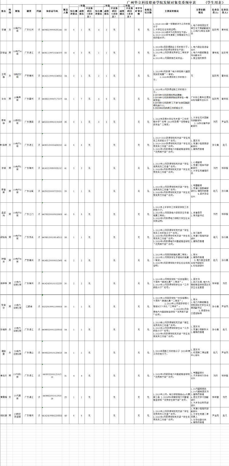 根據廣州華立科技職業(yè)學院黨委發(fā)展新黨員的要求,由學生本人提出申請,經電力與智能制造學院黨總支第二黨支部培養(yǎng)考察、民主推薦,黨總支審查,2020年10月25日預審討論決定將孫瑜聆等18位同志列為近期預備黨員發(fā)展對象,總支將在近期召開黨員大會討論他們的入黨問題并上報黨委審核。為了進一步增強發(fā)展黨員的透明度,確保發(fā)展新黨員的質量,根據《中國共產黨發(fā)展黨員工作細則(試行)》等文件的有關精神,現將發(fā)展對象的名單公示如下(具體名單見附件):
