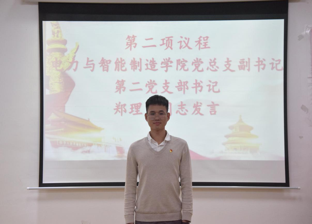 電力與智能制造學院黨總支書記、第二黨支部書記鄭理廣同志發(fā)表講話,他首先對各位預備黨員進行了肯定,表揚了他們能夠在校外實習繁忙且疫情嚴峻的情況下按時返校參加轉正大會的端正態(tài)度。隨后,預祝13位預備黨員可以如期轉為中共正式黨員。