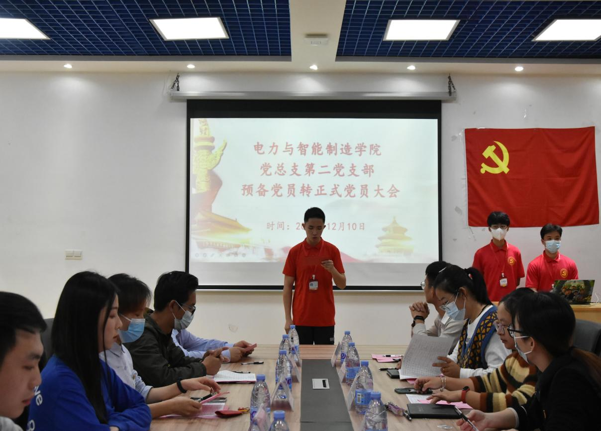 2021年12月10日下午,電力與智能制造學院黨總支在科技樓五樓召開了2021年下半年預備黨員轉正大會,大會討論孫瑜聆等13位預備黨員轉為中共正式黨員事宜。