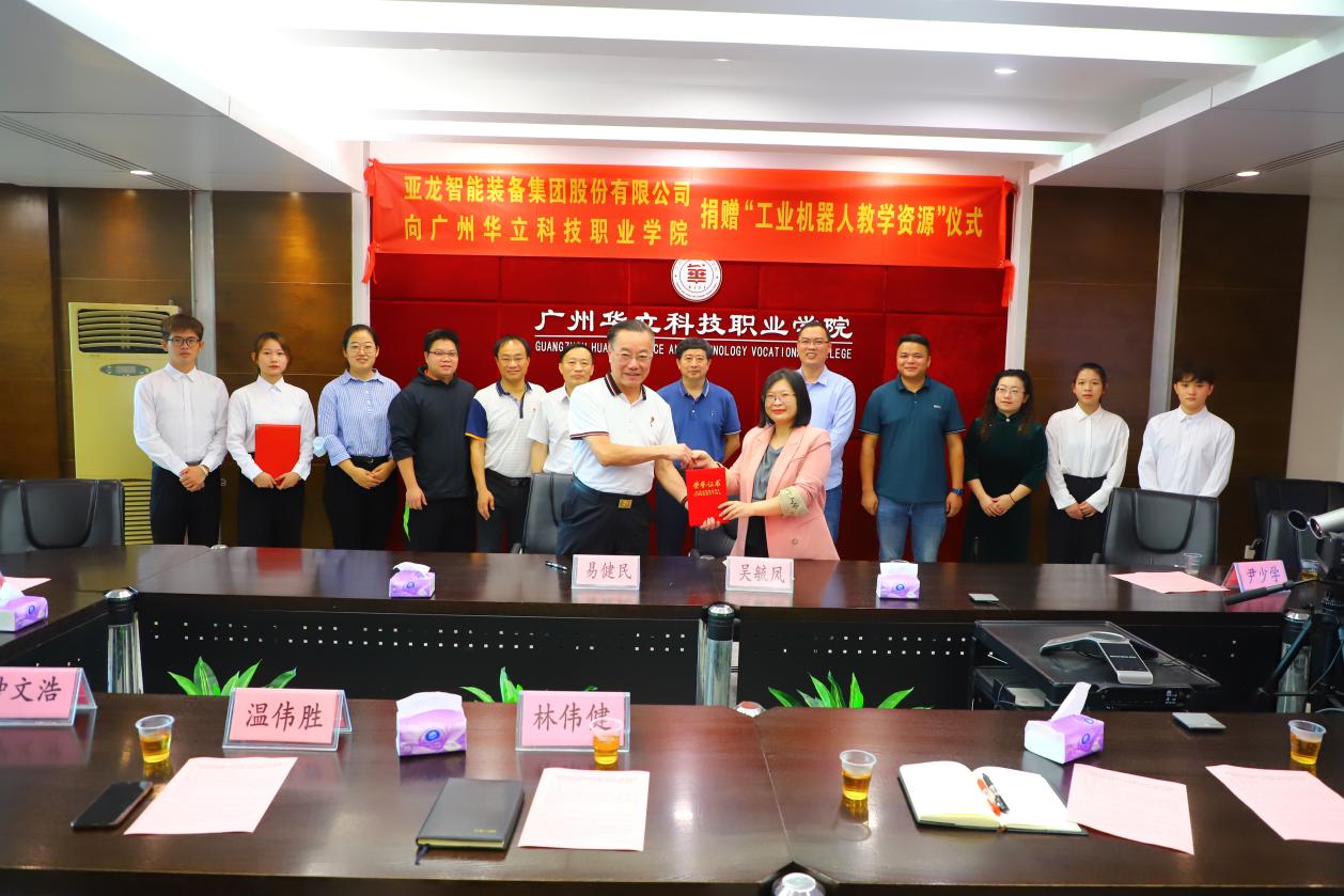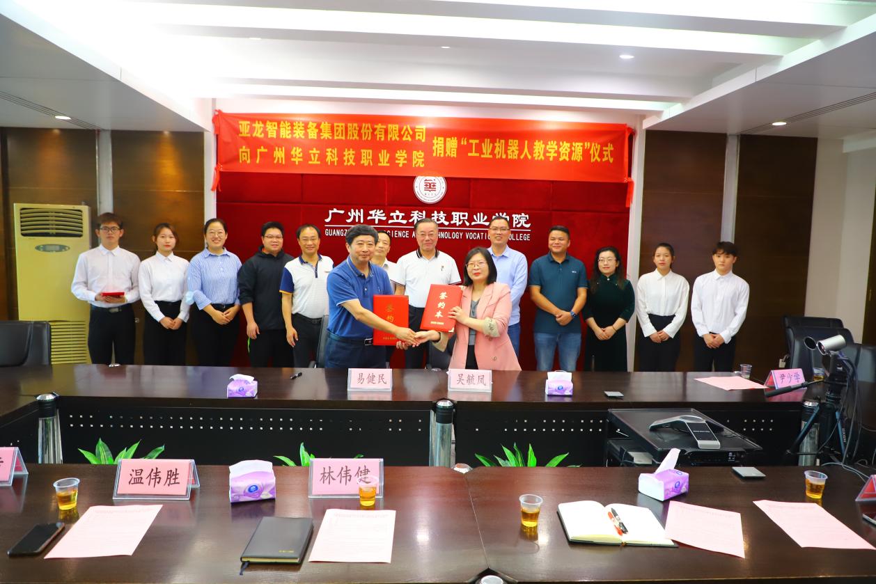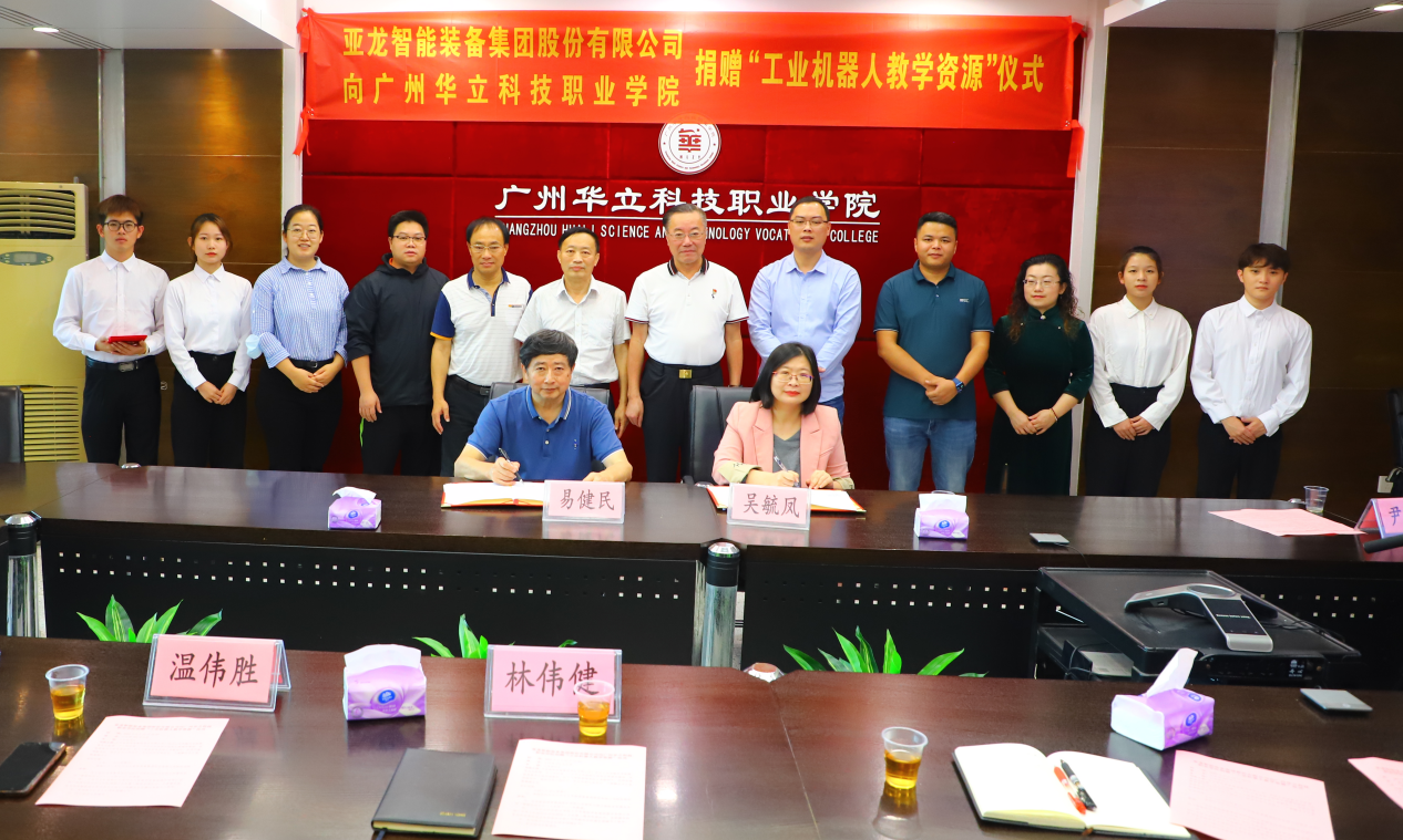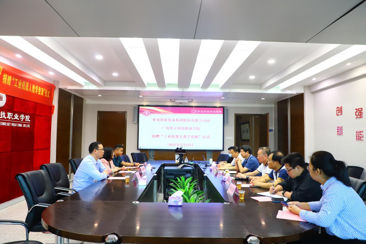 5月15日上午,亞龍智能裝備集團股份有限公司向廣州華立科技職業(yè)學(xué)院捐贈“工業(yè)機器人教學(xué)資源”儀式在行政樓305舉行。亞龍智能裝備集團股份有限公司廣東分公司吳毓鳳總經(jīng)理、李志文經(jīng)理、尹少學(xué)經(jīng)理、廣州華立科技職業(yè)學(xué)院校長易健民教授、黨委書記林偉健教授、科研處溫偉勝處長、校外教學(xué)與就業(yè)處鐘文浩處長、電力與智能制造學(xué)院王秀敏院長、學(xué)校產(chǎn)教融合辦公室陳茜副主任參加捐贈儀式。捐贈儀式由王秀敏院長主持。