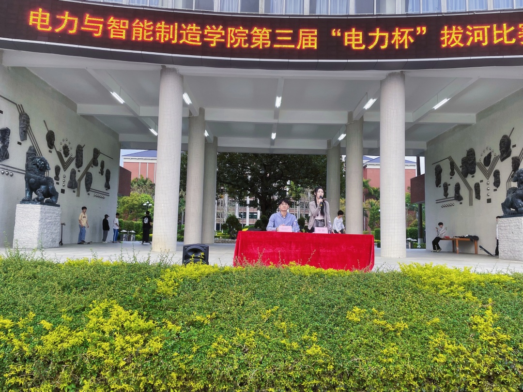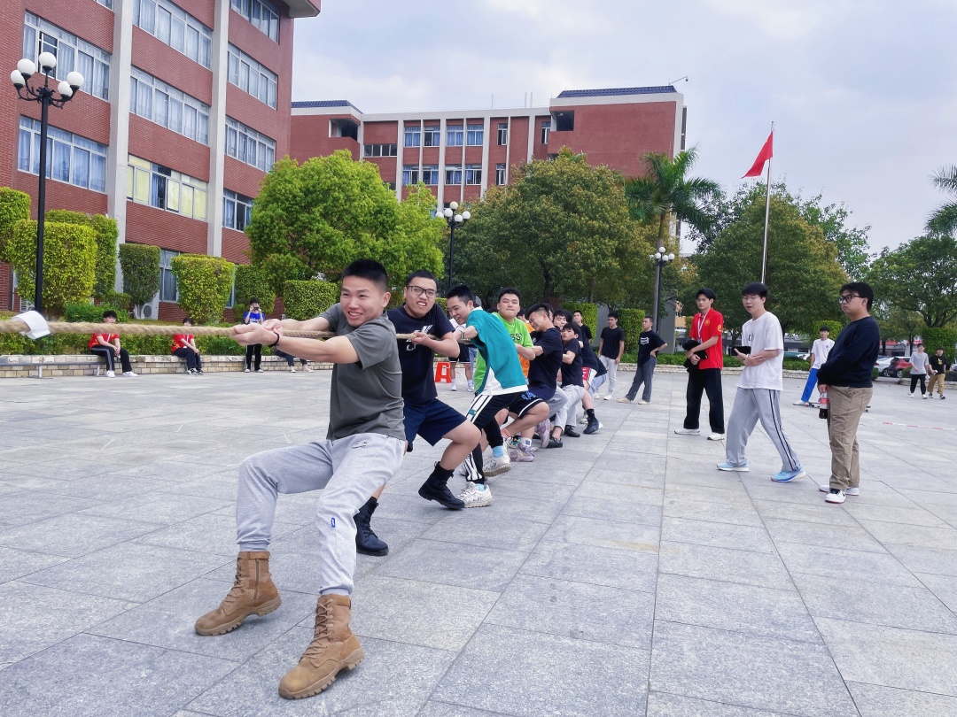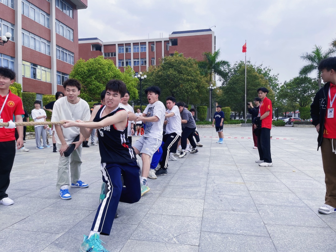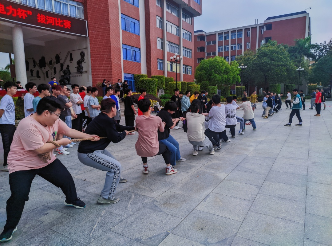 比賽有序進(jìn)行,裁判哨子吹響;此時(shí),雙方隊(duì)員齊聲高喊口令,大家齊心協(xié)力,卯足勁將繩子向自己方向拉;雙方啦啦隊(duì)為自己班級(jí)加油助威。加油聲、吶喊聲響切徘徊在廣場(chǎng)。