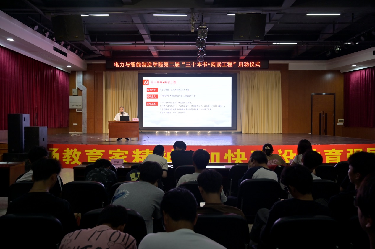 為持續(xù)開展好“儒雅電力人”文化育人項(xiàng)目建設(shè),電力與智能制造學(xué)院黨總支于10月21日和10月23日,分別兩場在圖書館8樓,開展第二屆“三十本書?閱讀工程”啟動儀式。學(xué)院黨總支書記、院長褚玉峰、黨總支專職副書記鄭理廣、學(xué)院團(tuán)委書記鐘穎、輔導(dǎo)員劉浩、鄒思敏、伍景太、郭曉倩、王曼霞及學(xué)院2024級全體同學(xué)參加了這次啟動儀式。
