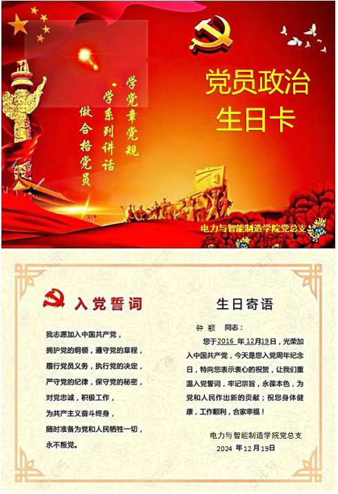 作為電力與智能制造學院的一名黨員教師鐘穎,在收到學院黨組織發(fā)來的“政治生日”賀卡,我的心情特別興奮,也感謝組織的關懷。12月19日,是我的政治生日,我認為政治生日是表達對黨的忠誠和堅定的重要時刻。