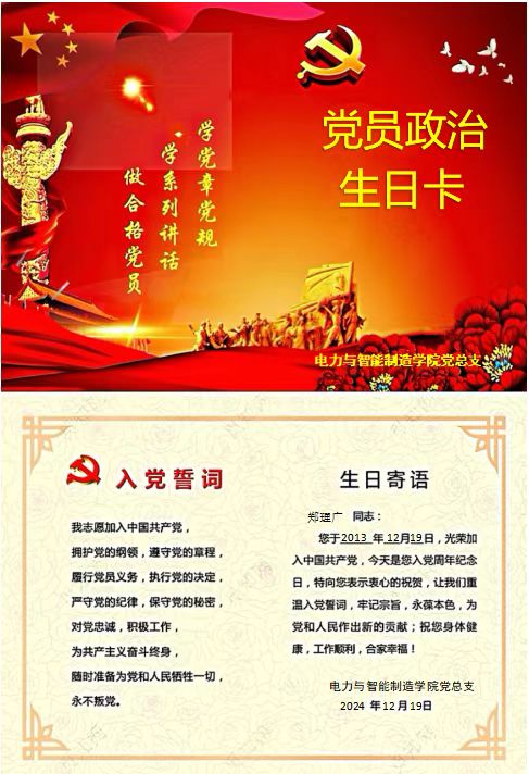 作為電力與智能制造學院的一名黨員教師鄭理廣,在收到學院黨組織發(fā)來的“政治生日”賀卡,我的心情特別興奮,也感謝組織的關懷。12月19日是我的政治生日,這不僅是一個簡單的紀念日,而是我內(nèi)心深處對黨深沉情感的流露,是我對黨的無限忠誠和堅定信仰的深情表達。