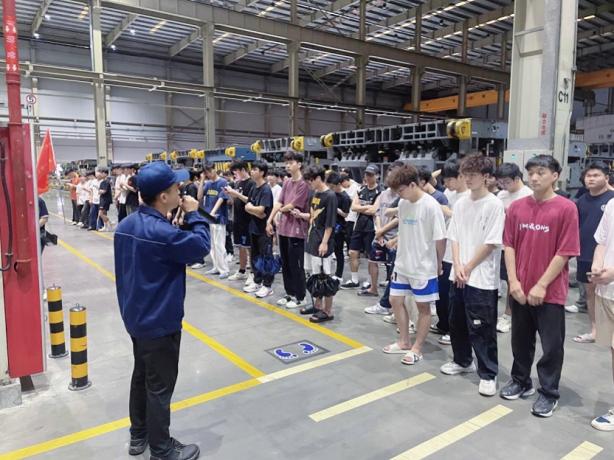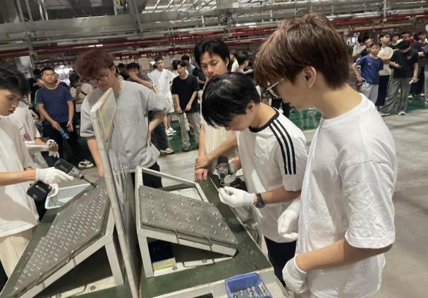 在講解員的引導(dǎo)下,師生們依次走進(jìn)沖壓、焊裝、總裝等工藝車間,了解汽車制造從零部件到整車的全流程。目睹高度自動(dòng)化生產(chǎn)線的機(jī)械韻律,凝視全智能機(jī)器人焊接的火花,駐足嚴(yán)格質(zhì)量保障體系執(zhí)行的現(xiàn)場(chǎng),同學(xué)不僅見證了現(xiàn)代汽車制造的科技實(shí)力,更被“行有道·達(dá)天下”的企業(yè)文化于“奮力拼搏、團(tuán)結(jié)協(xié)作、知難而進(jìn),志在必得”的企業(yè)精深深觸動(dòng)。正是新時(shí)代產(chǎn)業(yè)工人每個(gè)技術(shù)突破的累積,構(gòu)筑起現(xiàn)代化產(chǎn)業(yè)體系的基石;正是每道精益求精的制造工藝,書寫著技能報(bào)國(guó)的青春答卷。