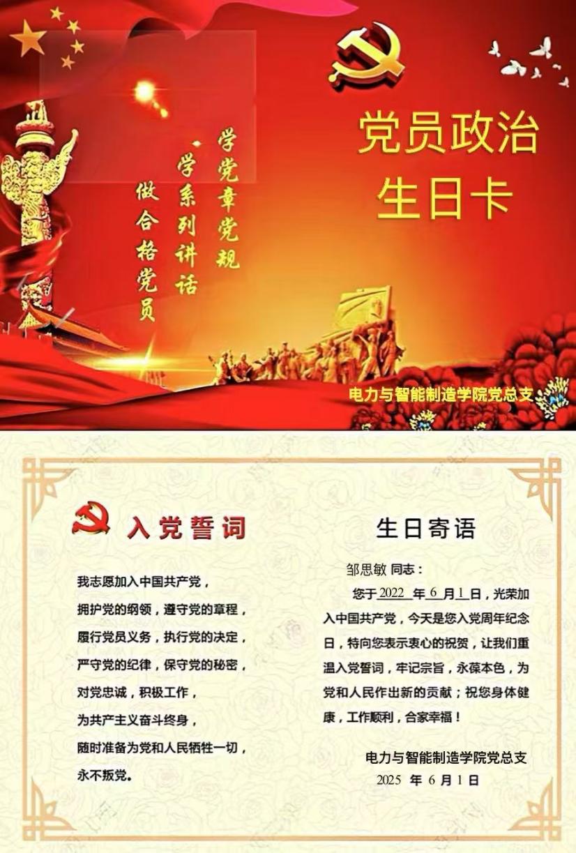 作為電力與智能制造學院黨總支教師黨支部的一名教師黨員鄒思敏,6月1日早上,收到了學院黨組織的發(fā)“政治生日”賀卡,心情特別興奮,2021年6月1日是我加入中國共產(chǎn)黨的日子。
