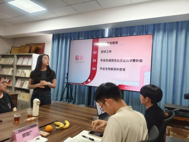 輔導(dǎo)員鐘穎老師分享了學(xué)生安全教育、團(tuán)學(xué)工作、畢業(yè)生誠信資助及征兵學(xué)費(fèi)補(bǔ)助、畢業(yè)生檔案資料管理。她強(qiáng)調(diào),在活動中應(yīng)注重提高同學(xué)們的參與積極性,從而實(shí)現(xiàn)教育成果的最大化。