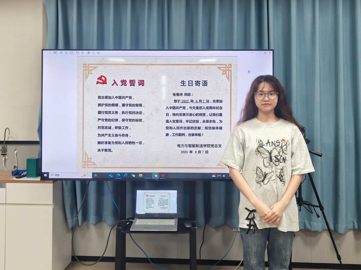 6月7日,電力與智能制造學(xué)院的黨員教師張愉玲收到了學(xué)院黨組織發(fā)的“政治生日”賀卡。一場(chǎng)莊重且意義非凡的政治生日活動(dòng)在學(xué)校會(huì)議室舉行?;顒?dòng)在莊嚴(yán)的氛圍中拉開(kāi)帷幕,張愉玲同志面向鮮艷的黨旗,舉起右拳,重溫入黨誓詞。每一個(gè)字都擲地有聲,每一句誓言都飽含著對(duì)黨的忠誠(chéng)和為黨的事業(yè)奮斗終身的決心。這不僅是對(duì)入黨初心的重溫,更是對(duì)未來(lái)行動(dòng)的承諾,激勵(lì)著黨員們時(shí)刻以高標(biāo)準(zhǔn)嚴(yán)格要求自己,在工作和生活中發(fā)揮先鋒模范作用。
