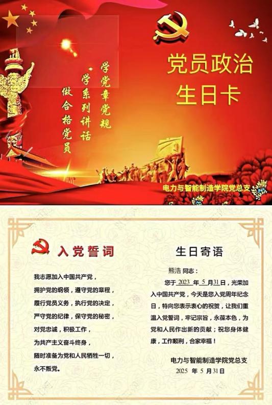 作為電力與智能制造學(xué)院云浮校區(qū)的一名教師黨員熊浩,2025年5月31日收到學(xué)院黨組織發(fā)的“政治生日”賀卡,我滿心歡喜,更懷著對組織深切關(guān)懷的感恩之情,迎來政治生日這一極具紀(jì)念意義的時(shí)刻——5月31日。于我而言,政治生日承載著對黨無限忠誠與堅(jiān)定信念的莊重宣示?;厥淄?,入黨時(shí)那火紅黨旗的鮮艷色彩,早已深深烙印在我內(nèi)心深處,成為永不褪色的精神底色;而那莊嚴(yán)的入黨誓詞,每一個(gè)字、每一句話,都已融入我的靈魂,化作前行的不竭動(dòng)力。這力量,賦予鋼鐵般的黨性意志,讓我在黨的事業(yè)征程中,無畏艱難險(xiǎn)阻,勇往直前。我愿將拼搏與奉獻(xiàn)當(dāng)作最質(zhì)樸的行動(dòng)語言,在黨的工作中傾盡心力,不求回報(bào),只盼為黨和人民的事業(yè)添磚加瓦,用一生踐行入黨時(shí)的錚錚誓言,不負(fù)組織的培養(yǎng)與期望。