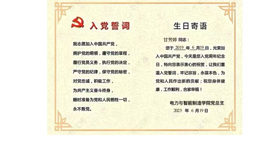 2025年6月19日,作為電力與智能制造學(xué)院云浮校區(qū)的教師黨員,收到了黨組織送來的“政治生日”賀卡。這一天,于我而言,意義非凡。它不僅是我政治生日的莊嚴(yán)誕辰,更像是一座永不熄滅的燈塔,照亮信仰的征程,讓象征著理想與信念的火種,在歲月的長河中生生不息,始終散發(fā)著溫暖而堅定的光芒。在教育教學(xué)的道路上和探索中,在服務(wù)師生的點滴日常里,推動著我無畏向前,永不停歇。