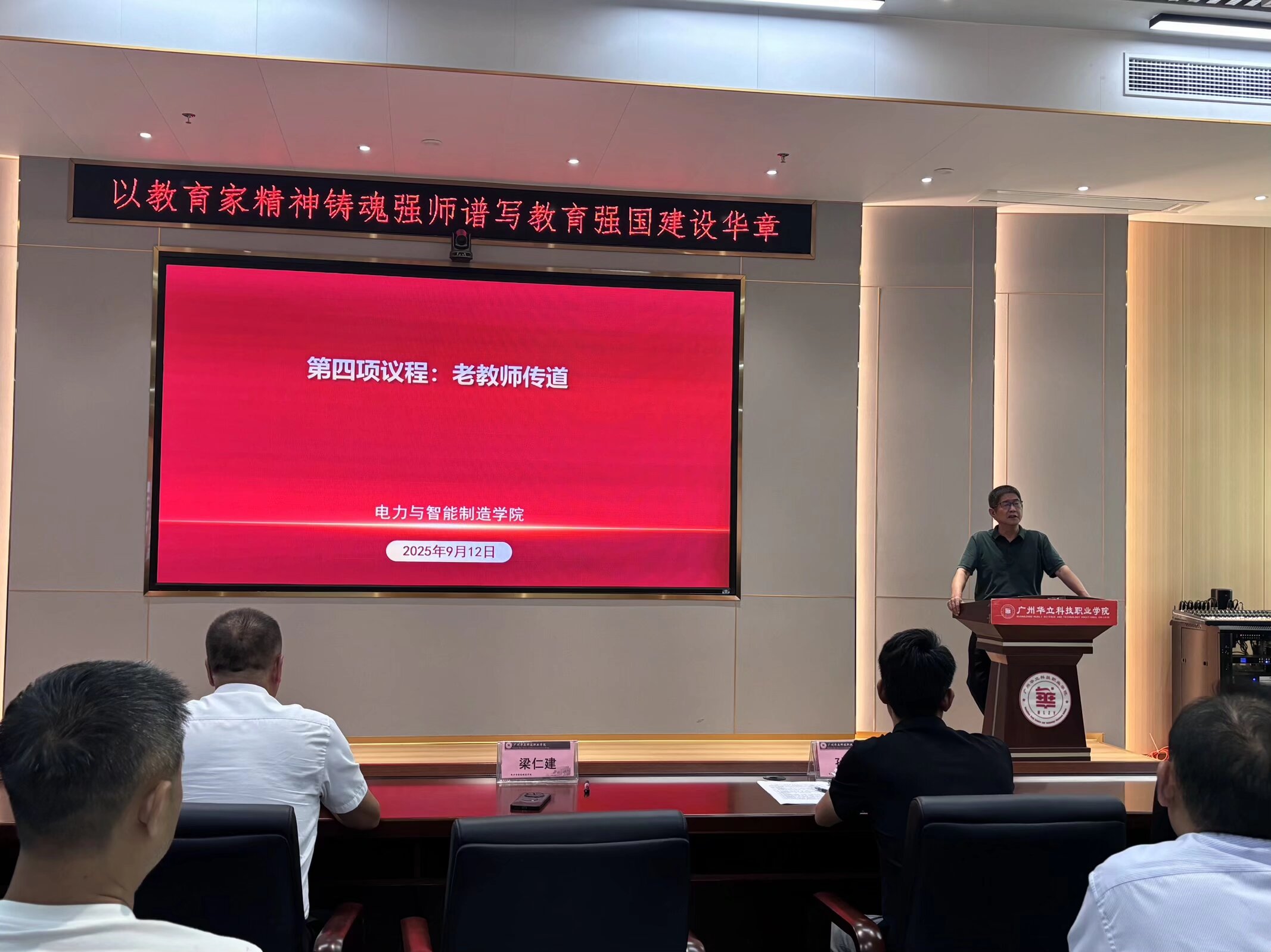 接著,現(xiàn)場(chǎng)簽訂承諾書(shū)。全體教師簽署《廣州華立科技職業(yè)學(xué)院教師師德師風(fēng)承諾書(shū)》,以書(shū)面形式固化承諾內(nèi)容,進(jìn)一步強(qiáng)化對(duì)師德師風(fēng)規(guī)范的認(rèn)同與踐行,彰顯全體教師恪守師德、潛心育人的堅(jiān)定決心。會(huì)上公布了電力與智能制造學(xué)院“老帶新”傳幫帶名單。本次傳幫帶分為兩個(gè)組別:其一,由電力學(xué)院四名老教授與新教師建立“一對(duì)一”指導(dǎo)關(guān)系,助力新教師快速提升教學(xué)能力與職業(yè)素養(yǎng);其二,安排四名經(jīng)驗(yàn)豐富的輔導(dǎo)員對(duì)新輔導(dǎo)員開(kāi)展“一對(duì)一”指導(dǎo),為新輔導(dǎo)員開(kāi)展學(xué)生工作筑牢基礎(chǔ)。
