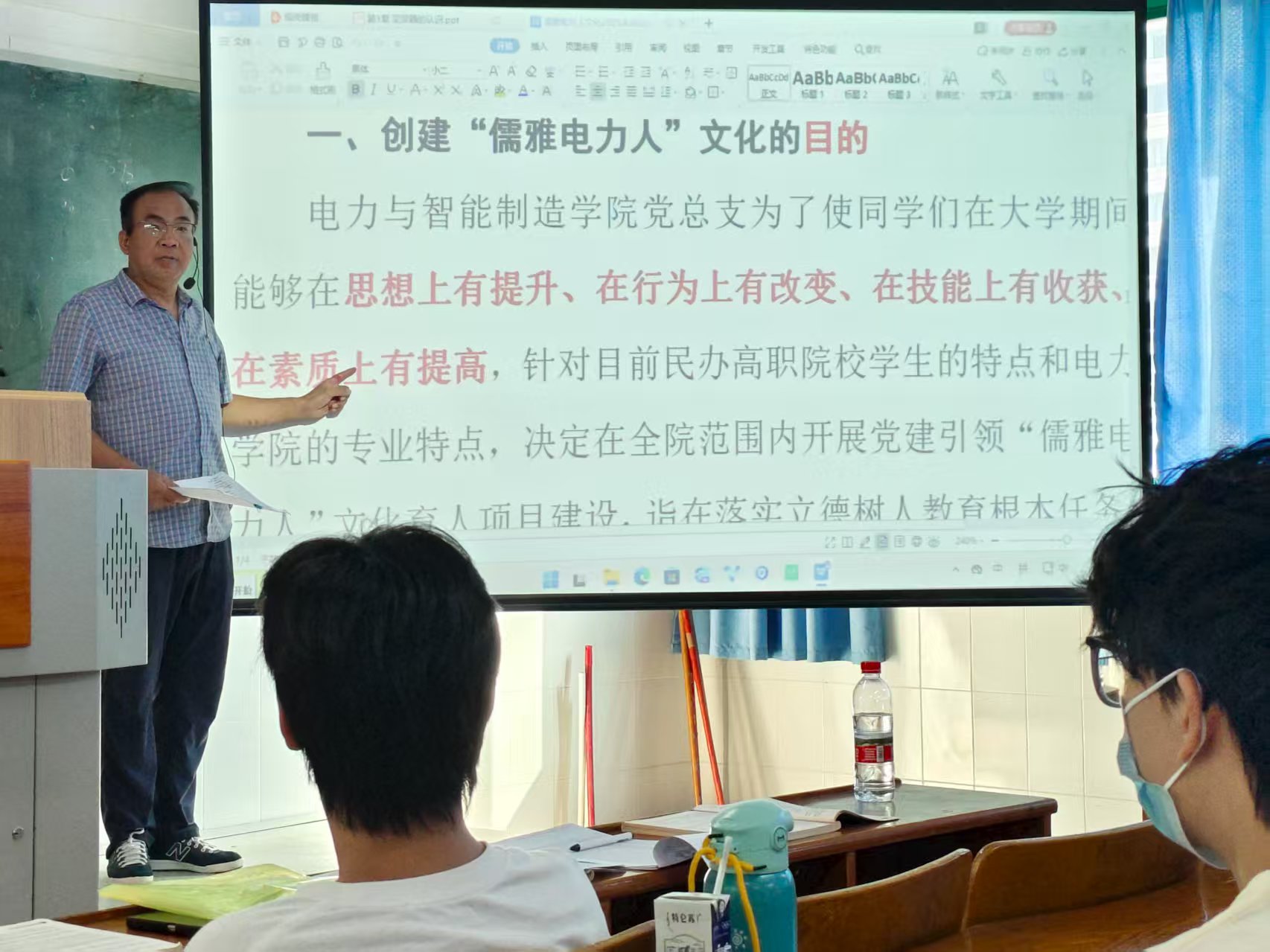 在“儒雅電力人”文化講解環(huán)節(jié),教師們結(jié)合學(xué)院發(fā)展歷程與各個專業(yè)行業(yè)特色,從“儒雅”的精神內(nèi)涵、行為準(zhǔn)則展開闡述。引導(dǎo)學(xué)生理解“儒雅”不僅是外在言行的得體,更是內(nèi)在專業(yè)素養(yǎng)、責(zé)任擔(dān)當(dāng)?shù)捏w現(xiàn)。在實驗室中嚴(yán)謹(jǐn)操作、在學(xué)習(xí)中謙遜求知、在未來工作中恪守行業(yè)規(guī)范,皆是“儒雅電力人”的生動實踐。針對大一新生,教師重點講解文化認(rèn)知與角色轉(zhuǎn)變,幫助其建立學(xué)院歸屬感;對于大二,則結(jié)合專業(yè)學(xué)習(xí)進(jìn)度,強(qiáng)調(diào)將文化理念融入專業(yè)實踐。各位老師還為學(xué)生們講解了“三寶學(xué)風(fēng)”建設(shè)內(nèi)涵。“書、筆、本|”三件寶貝,作為學(xué)風(fēng)建設(shè)的核心載體,需要學(xué)生每節(jié)課都攜帶,方便記錄教師補(bǔ)充內(nèi)容和做作業(yè),這些都屬于學(xué)習(xí)態(tài)度的考核內(nèi)容。