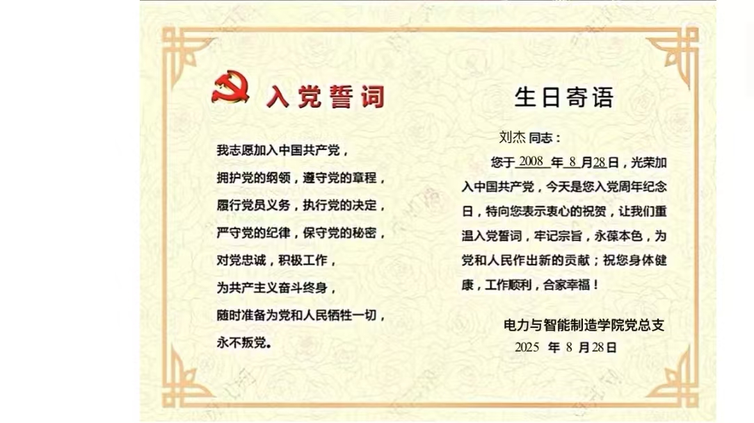 作為電力與智能制造學(xué)院教師黨支部的一名教師黨員劉杰,8月28日早上收到了學(xué)院黨組織發(fā)來(lái)的“政治生日”賀卡,心情特別興奮,轉(zhuǎn)眼間,加入中國(guó)共產(chǎn)黨已經(jīng)17年。