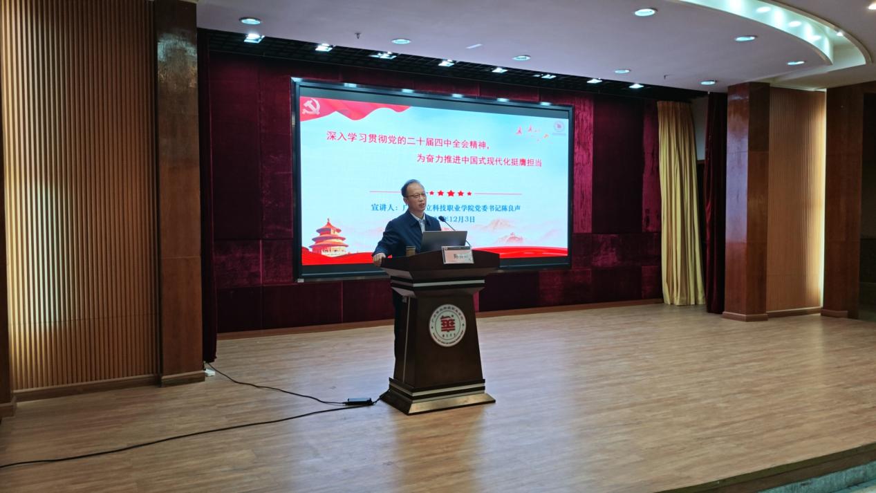 12月3日下午,在學校東區(qū)圖書館一號報告廳,學校黨委書記陳良聲以“深入學習貫徹黨的二十屆四中全會精神,為奮力推進中國式現(xiàn)代化挺膺擔當”主題,為電力學院300余名師生宣講黨的二十屆四中全會精神。