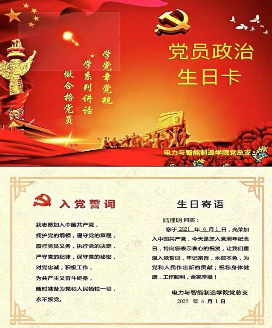 作為電力與智能制造學(xué)院的一名教師黨員陸建明,6月1日早上,收到了學(xué)院黨組織的發(fā)“政治生日”賀卡,心情特別興奮,6月1日是我加入中國(guó)共產(chǎn)黨的日子。