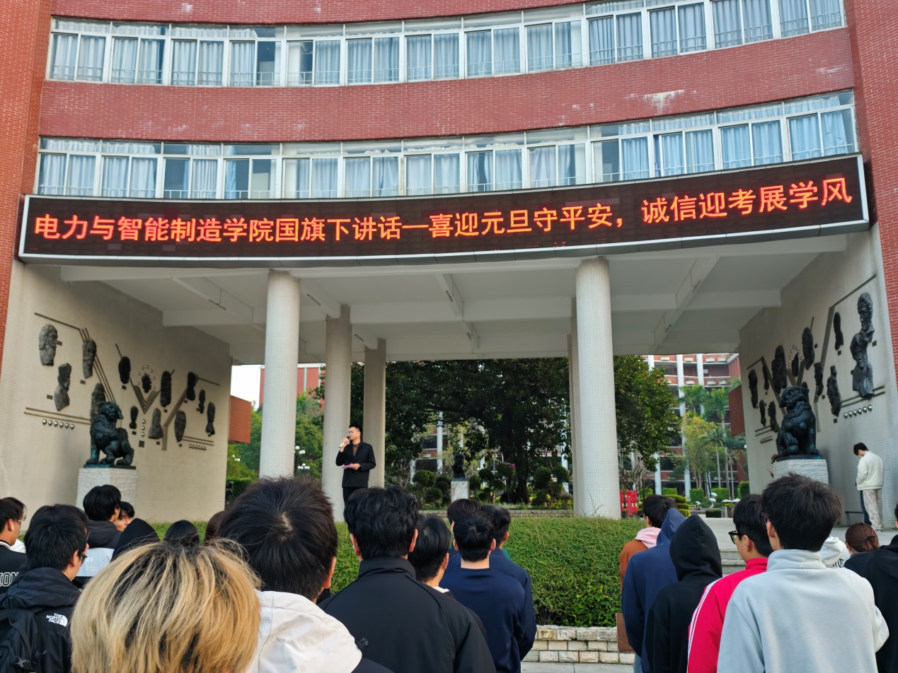 電力與智能制造學(xué)院學(xué)管主任鄭理廣老師在國(guó)旗下講話中,回顧了2025年電力學(xué)院師生攜手奮進(jìn)的拼搏歷程,向大家致以新年的美好祝福,號(hào)召全體師生以飽滿熱情迎接2026年的新征程。針對(duì)元旦假期與校園日常安全,同時(shí)重點(diǎn)強(qiáng)調(diào)了交通安全、消防安全與校園安全的核心要求,提醒同學(xué)們遵守交通規(guī)則、規(guī)范用電用火、文明課間活動(dòng),始終將“生命至上,安全第一”的理念牢記心間,共同守護(hù)和諧平安的校園環(huán)境。最后,面對(duì)即將到來(lái)的期末考試,鄭理廣老師提出三點(diǎn)希望一要科學(xué)制定復(fù)習(xí)計(jì)劃,查漏補(bǔ)缺扎實(shí)備考;二要嚴(yán)守考試紀(jì)律,拒絕抄襲作弊,以真實(shí)成績(jī)彰顯品德;三要調(diào)整心態(tài)從容應(yīng)考,正確看待考試的檢驗(yàn)意義。