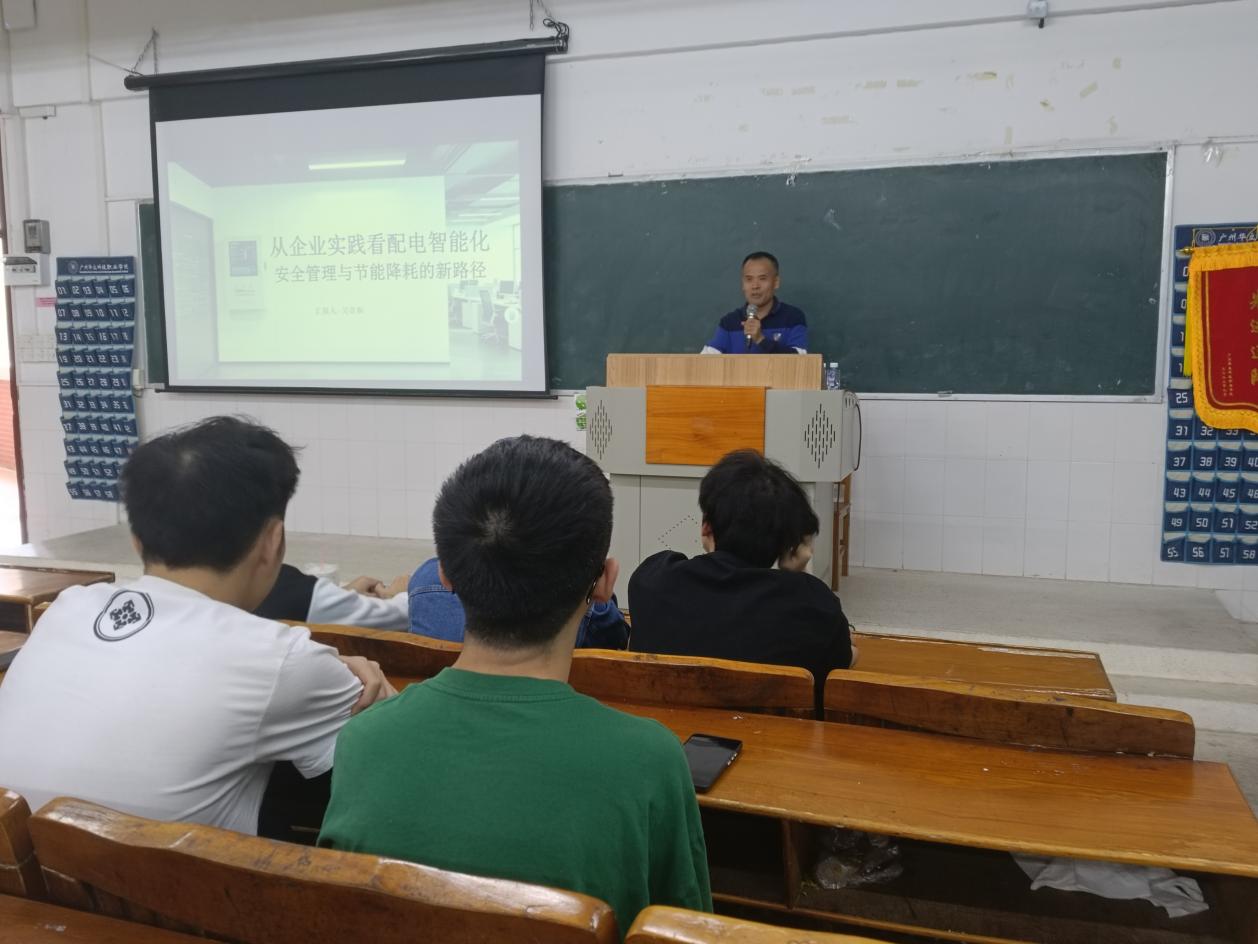 講座現(xiàn)場,吳貴和副董事長圍繞主題,結(jié)合自身數(shù)十年的企業(yè)實踐經(jīng)驗及廣州銀變電力的發(fā)展歷程,從配電智能化的發(fā)展背景、核心技術(shù)應(yīng)用入手,重點講解了企業(yè)在配電安全管理中的實操要點、常見隱患排查方法,以及節(jié)能降耗領(lǐng)域的創(chuàng)新技術(shù)與實踐路徑。他摒棄晦澀的理論說教,采用“理論+企業(yè)真實案例”的方式,結(jié)合廣州銀變電力在配電設(shè)備智能化升級中的實踐,以及行業(yè)內(nèi)利用“物聯(lián)網(wǎng)+大數(shù)據(jù)”實現(xiàn)智慧用電、節(jié)能降耗的典型案例,生動剖析了配電智能化系統(tǒng)在安全管控、能效優(yōu)化中的應(yīng)用場景,分享了企業(yè)通過智能化改造實現(xiàn)安全升級、降低能耗的成功經(jīng)驗——如通過智能監(jiān)測終端實時采集電氣參數(shù)、排查安全隱患,有效提升供電可靠性,同時降低線損與人工運維成本,讓在場學(xué)生對配電智能化的實踐價值有了直觀且深刻的認知。