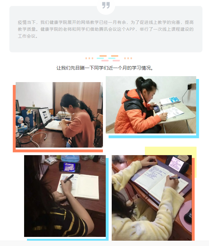 健康學院于2020年4月3號晚,借助騰訊會議這個APP在線上進行關(guān)于健康學院網(wǎng)絡(luò)課程建設(shè)工作的會議。出席的成員有:李君副院長、李桂林院長助理、學管主任宋依謎老師、教學主任胡筱蕾老師、輔導(dǎo)員及各班的班干均受邀于此次會議。