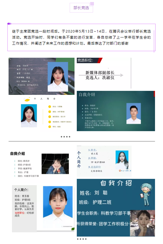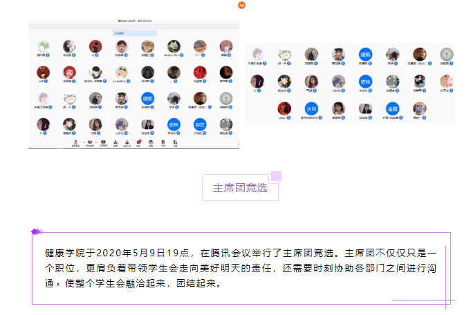 為了更好建設(shè)一支具有團(tuán)結(jié)、凝聚力的學(xué)生干部隊(duì)伍,健康學(xué)院團(tuán)總支學(xué)生會(huì)秉承著“樹學(xué)院之風(fēng),溢學(xué)生之彩”的宗旨,腳踏實(shí)地,建設(shè)高質(zhì)量的服務(wù)工作。2020年5月,健康學(xué)院團(tuán)總支學(xué)生第二屆干部競(jìng)選活動(dòng)在騰訊會(huì)議順利舉行