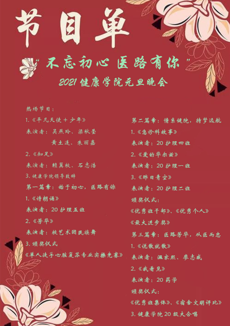 2020年12月23日星期三6點(diǎn)半我們齊聚禮堂,在這個(gè)璀璨之夜我們迎來了健康學(xué)院第一屆元旦文藝匯演,出席的嘉賓有學(xué)院領(lǐng)導(dǎo),主任,各兄弟學(xué)院干部,學(xué)生會(huì)干事干部及健康學(xué)院19-20級(jí)的同學(xué)們。