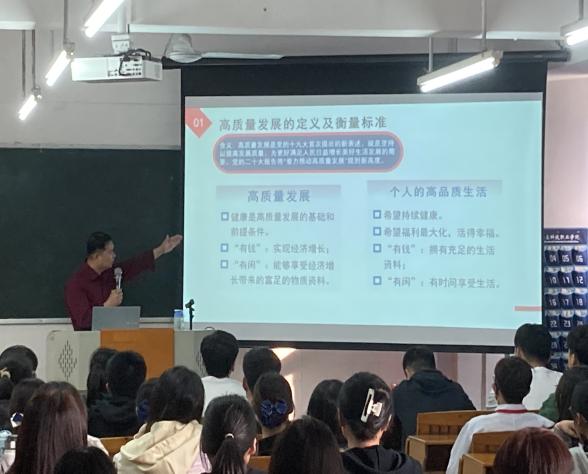 雷毅雄院長(zhǎng)從黨和國(guó)家過(guò)去5年和新時(shí)代10年偉大變革中,結(jié)合自身感受,深入解讀了黨的二十大精神、高質(zhì)量發(fā)展的定義及衡量標(biāo)準(zhǔn),深刻闡述高質(zhì)量發(fā)展作為全面建設(shè)社會(huì)主義現(xiàn)代化國(guó)家首要任務(wù)的重大意義。隨后,針對(duì)如何實(shí)現(xiàn)高質(zhì)量發(fā)展,雷毅雄院長(zhǎng)從從市場(chǎng)機(jī)制、財(cái)政政策、科技創(chuàng)新等方面詳細(xì)介紹了二十大報(bào)告的相關(guān)內(nèi)容。最后,雷毅雄院長(zhǎng)指出,作為大學(xué)生,推進(jìn)高質(zhì)量的發(fā)展就是如何提高自己的全面發(fā)展,并對(duì)同學(xué)們?cè)谔岣咦陨砣姘l(fā)展上提出了幾點(diǎn)要求:一要樹(shù)立正確的人生觀;二要樹(shù)立正確的價(jià)值觀三要堅(jiān)持做好修身養(yǎng)性;四要積極重視身體鍛煉;五要堅(jiān)持自力自強(qiáng)。雷院的諄諄話語(yǔ),殷殷囑托,激發(fā)了同學(xué)們?yōu)槟繕?biāo)不懈奮斗的澎湃力量。
