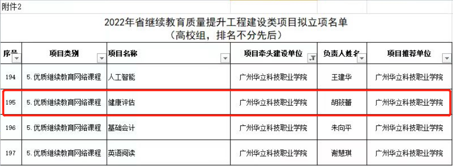根據(jù)《廣東省教育廳關(guān)于開(kāi)展2022年省繼續(xù)教育質(zhì)量提升工程建設(shè)類(lèi)項(xiàng)目申報(bào)工作的通知》等文件要求,經(jīng)地級(jí)以上市教育局和高校推薦、資格審查、專(zhuān)家評(píng)分等環(huán)節(jié),廣東省教育廳公布了2022年廣東繼續(xù)教育質(zhì)量提升工程建設(shè)類(lèi)項(xiàng)目擬立項(xiàng)名單,共評(píng)出立項(xiàng)項(xiàng)目773個(gè)。我院《健康評(píng)估》課程喜獲立項(xiàng)優(yōu)質(zhì)繼續(xù)教育網(wǎng)絡(luò)課程。