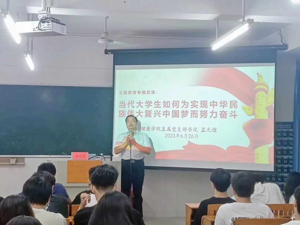 根據(jù)學(xué)校黨委關(guān)于深入開(kāi)展學(xué)習(xí)貫徹習(xí)近平新時(shí)代中國(guó)特色社主義思想主題教育專題黨課安排,2023626日晚,健康學(xué)院直屬黨支部在西2-205教室,為健康學(xué)院22級(jí)學(xué)生干部代表和黨建小組成員組織一堂別開(kāi)生面的專題黨課。黨支部書(shū)記孟允煌以《當(dāng)代大學(xué)生如何為實(shí)現(xiàn)中華民族偉大復(fù)興中國(guó)夢(mèng)而努力奮斗》為主題,鼓勵(lì)同學(xué)們刻苦學(xué)習(xí)、勇于實(shí)踐、艱苦奮斗、與時(shí)俱進(jìn)、開(kāi)拓創(chuàng)新,用自己勤勞的雙手收獲成功、托起自己的夢(mèng)、托起中國(guó)夢(mèng)。