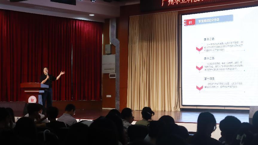 校園生活當(dāng)然離不開學(xué)校的規(guī)章制度,學(xué)生處宋依謎科長給同學(xué)們介紹了學(xué)生的違紀(jì)處分方法和申訴處理方法,以此來提醒同學(xué)們要遵守校園的規(guī)章制度,不要做違法亂紀(jì)的事情。