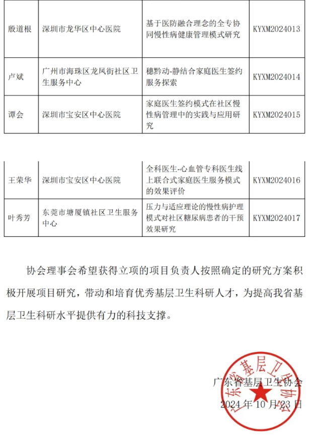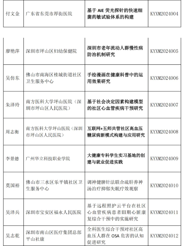 近日,廣東省基層衛(wèi)生協(xié)會(huì)公布了2024年度廣東省基層衛(wèi)生協(xié)會(huì)基層衛(wèi)生科研項(xiàng)目立項(xiàng)的評審結(jié)果,我院共計(jì)獲得三項(xiàng)省級協(xié)會(huì)項(xiàng)目立項(xiàng),推進(jìn)了我省基層衛(wèi)生事業(yè)發(fā)展,提高基層衛(wèi)生學(xué)術(shù)水平和服務(wù)能力。